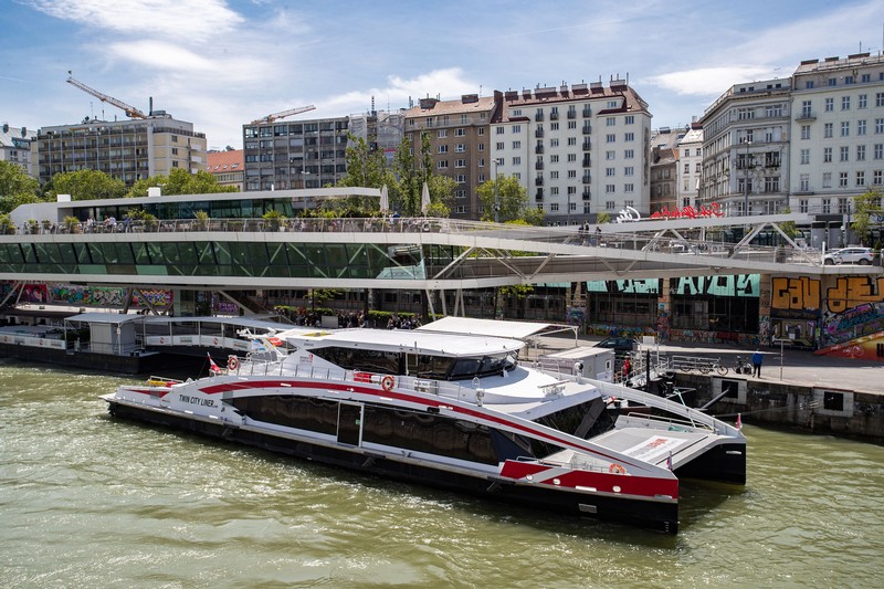 Auch der Twin City Liner der Central Danube ankert bei der Schiffstation am Schwedenplatz. Derzeit steuert der Schnellkatamaran mit dem neuen Austria-Ticket gleich drei reizvolle Destinationen in Österreich an: freitags und samstags geht es nach Tulln – die Gartenhauptstadt Österreichs, an Sonn- und Feiertagen stehen Orth an der Donau im Nationalpark Donau-Auen und die Mittelalterstadt Hainburg am Programm. Ab August fährt der Twin City Liner dann wieder nach Bratislava.
